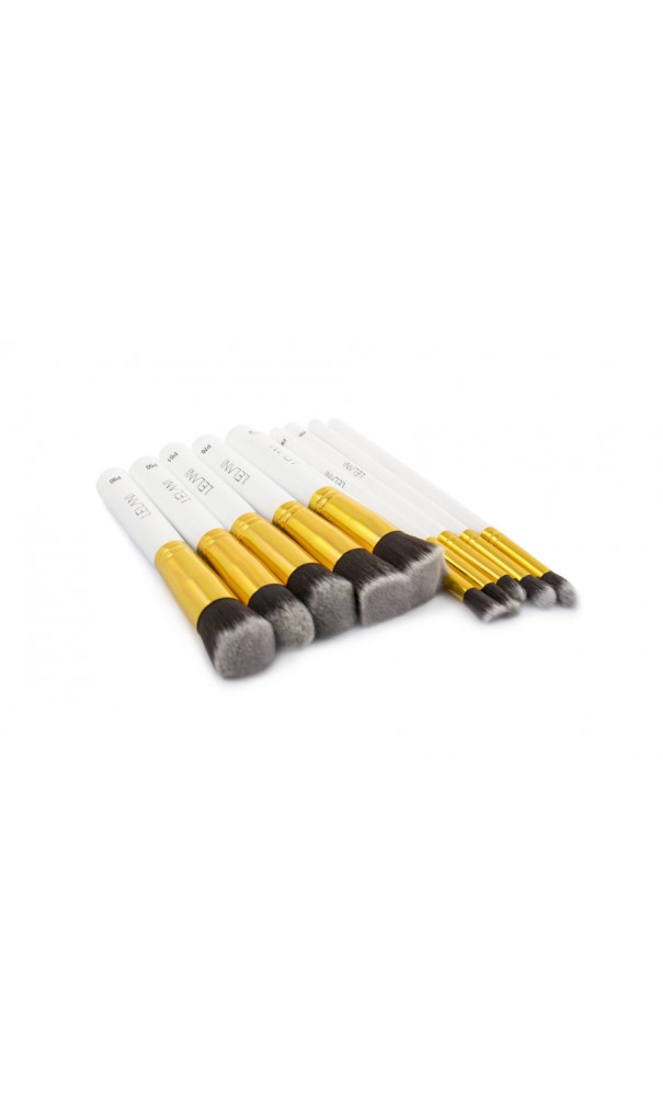 10vnt makiažo šepetėlių rinkinys skirtas makiažo meno pradedančiąjai. Sintetiniai šereliai, medinis kotelis. Lygūs sintetiniai šereliai savyje neužlaiko kosmetikos priemonių ko pasekoje taupomas jų naudojimas. Tokius šerelius lengviau išlaikyti švarius, jie mažiau linkę deformuotis. Tinkami kosmetikos pagrindui, pudrai, maskuokliui, skaistalams, akių šešėliams.